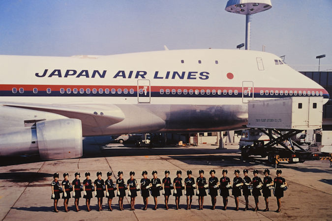 展示されている写真の一部から。JALで運行を開始したボーイング747と客室乗務員たちの姿、そして当時の国際線新ターミナル。