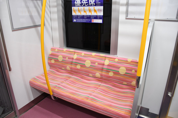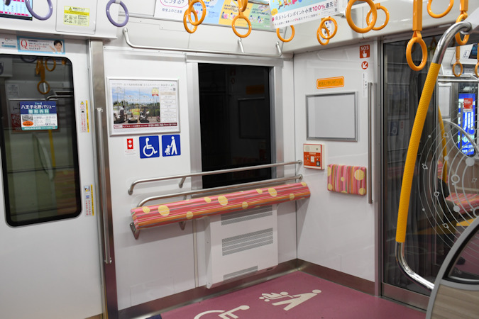 京王2000系の特徴である、5号車の「ひだまりスペース」。天地方向に拡大された窓と、低い場所にも設置された手すりにより、ベビーカーに乗った子どもでも外が見やすいのが特徴。
