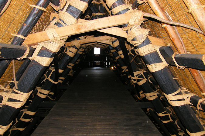 45〜60度という急傾斜の草葺の屋根が特徴的な合掌造りの家は、この白川村をはじめとした飛騨地方や富山県南部でかつては良く見られた構造の民家で、地域によっていろいろな種類がありますが、白川郷のものは「切妻合掌造り」と呼ばれるタイプ。本を開いて三角形に建てたような家で、雪の多い同地ならではの工夫となっています。また、南北に面して建っており、風の抵抗を最小限とし、さらに夏は涼しく、冬は暖かく保温できるような配慮がされています。