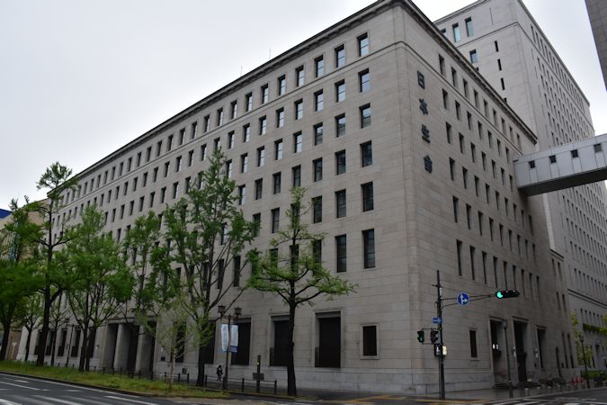大阪で創業し、1902年からこの場所に本社を構えた日本生命の本館で花崗岩を用いた重厚な外観が特徴。太平洋戦争に伴い、1938(昭和5)年に北半分が完成した後は工事が中断。GHQによる接収を経て、1962(昭和37)年に日建設計による設計で南半分が完成し、今に至ります。