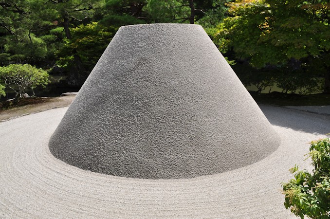 奥にある円錐台形の丘みたいなものは向月台と呼ばれ、高さ1.2m。また手前に広がる庭園は銀紗灘(ぎんしやだん)と呼ばれます。江戸時代中期頃から造られたと考えられています。