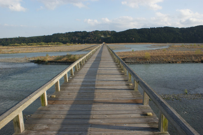 こうして完成した蓬莱橋でしたが、木橋のため川が増水するたび橋脚の流失などの被害を受けるため、1965(昭和40)年4月に橋脚をコンクリートのものに替えて現在の姿となります。現在の蓬莱橋は全長897.4m、通行幅2.7mで、1997(平成9)年12月30日には「世界一長い木造歩道橋」としてギネスブックにも登録。また、開通以来通行料金を払う今では数少ない賃取橋でもあります。