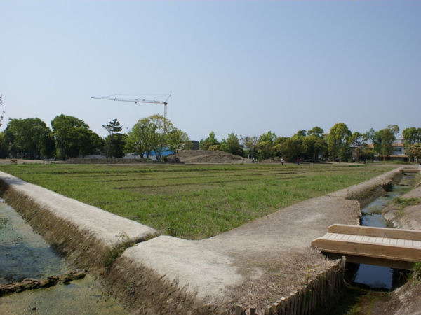 再整備以前の登呂遺跡はとにかく木が生い茂っていたのですが、このとおり伐採されて水田が復元されています。