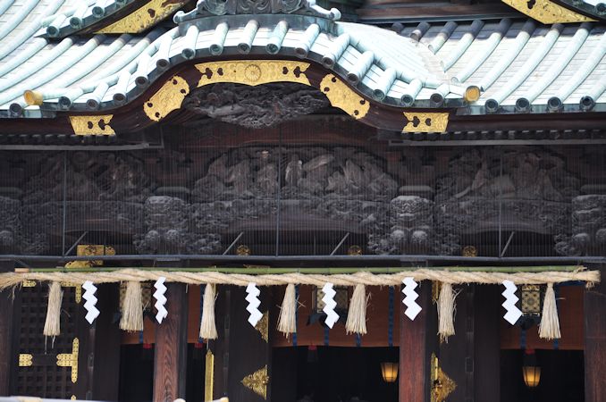 見事な彫刻は必見。正面には「松竹梅と鶴」の彫刻や、「黄石公と張良の図」の彫刻などが施されています。彫刻は当代の名工小沢半兵衛・小沢希道親子とその門弟のほか、後藤芳冶良らの手によるものです。