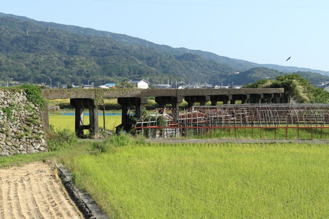 昭和8年築。奈半利町と安田町の間にある田野町の町域にあり、前後の築堤共々かなりの規模で残されています。写真には写っていませんが、奥側には奈半利川に架かっていた橋梁の橋脚も現存しています。