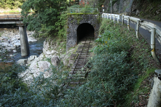 馬路村への重要な道路でもある県道12号線を北上しつつ安田川線の遺構を巡っていきます。まずはエヤ隧道。明治44年築で、安田川線で建設されたトンネルとしては最も下流側にあります。当時のトンネルは道路用に転用されているモノも多いのですが、古いせいか川側に道路を作っており現在は使用されていません。