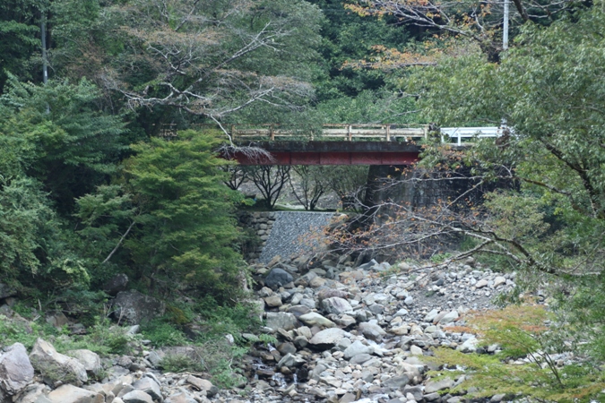 昭和7年築。現存する魚梁瀬森林鉄道の遺構群の中では最大規模を誇るもので、全長143m。かなりの距離を渡河することからトラス橋とガーダー橋の併用とされたようです。