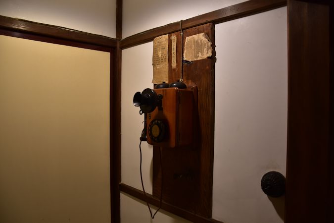 玄関の先には昔ながらの電話機が現存。1927(昭和2)年に登場した「2号自動式壁掛電話機」です。