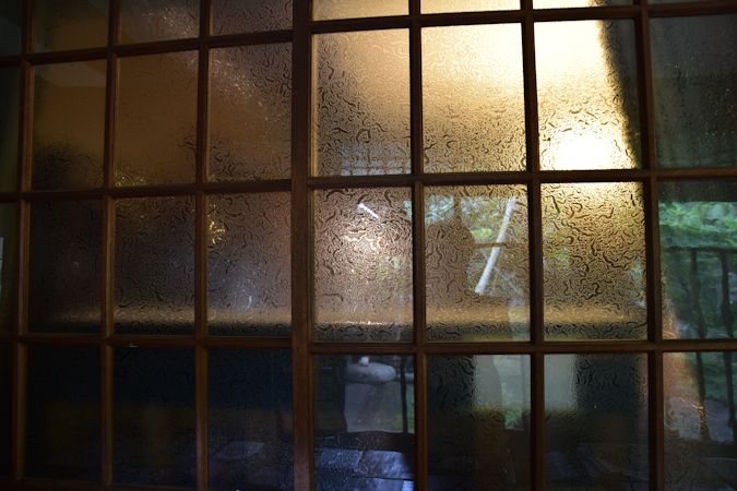 応接間のガラスは、結霜(けっそう)ガラスと呼ばれるもの。摺りガラスの表面にニカワを塗った後に乾燥させ、収縮したニカワを剥がすことで出来る模様です。