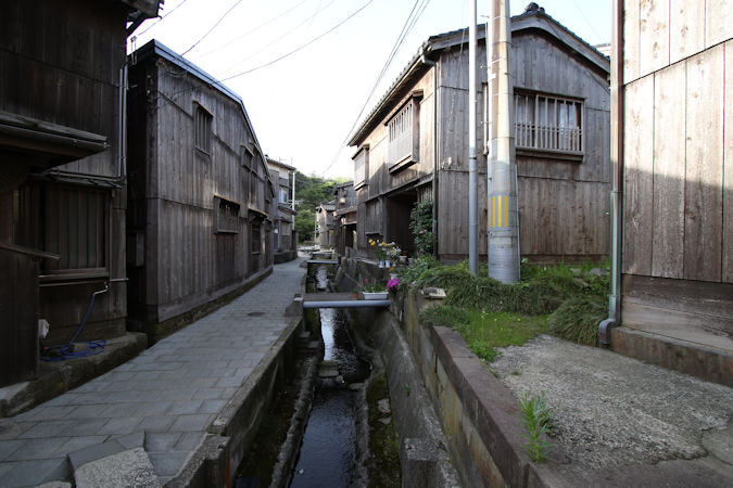 佐渡島西南に位置する佐渡市(旧小木町)宿根木(しゅくねぎ)は、国の重要伝統的建造物群保存地区に指定されている古い町並みが残る場所。中世から港があり、江戸時代は北前船稼業が盛んで、船大工と船主の集落として発展します。現在残る伝統的建造物は約100棟。船板などを利用した板張りの外壁を持つ2階建ての家が密集しているのが特徴であるほか、質素な外観とは裏腹に漆溜塗りなど豪華な仕上げが見られます。なお、上写真は公開民家(三角家)。2006(平成18)年まで使われていたもので、船大工が最大限に土地利用を図り、狭い路地の形状に合わせて三角形に建てたのが特徴です。