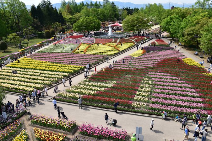 このページでは春に開催される「となみチューリップフェア」の様子(2018年)と、公園内に移築されている旧・中嶋家、旧・中越銀行本店(現・砺波郷土資料館)、公園内で保存されている中越鉄道(現在のJR氷見線、城端線など)の蒸気機関車「甲1形3号」(通称:中越弁慶号)を御紹介します。