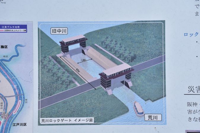 2005(平成17)年築。荒川と旧中川の最大で3.1m異なる水位を調節するために設置されました。