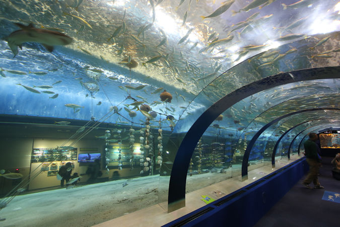 本州最北端の水族館であり、トンネル水槽「むつ湾の海」や「世界遺産白神の魚」コーナーが特徴。その他、サンゴ礁の魚、冷たい海の魚や希少淡水魚などを展示しています。また、水量700tのイルカプールにて、バンドウイルカとカマイルカのパフォーマンスが行われていますが、「祭り」をテーマにねぶた獅子をイメージした津軽三味線や笛の音色による音楽とコラボする、青森ならではの内容です。