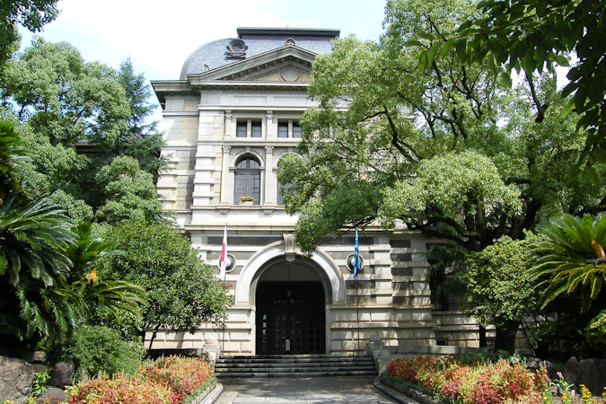また、相楽園から南東へ少し歩き、兵庫県庁の東隣に兵庫県公館(上写真)があります。これは1902(明治35)年に兵庫県本庁舎として山口半六の設計で建築されたもの。フランス・ルネサンス様式で、規模・優雅さ、ともに日本一の名声を博しましたが1945(昭和20)年3月に空襲によって外壁を残して焼失し、戦後に復旧工事が行われました。1985(昭和60)年に改修され、迎賓館と県政資料館の役割を担う兵庫県公館となりました。