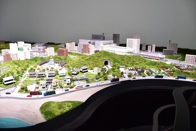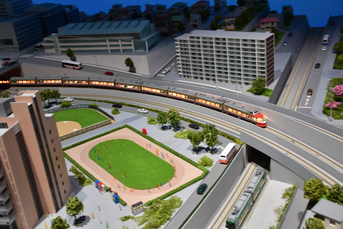 新宿から小田原原・箱根まで小田急線沿線を再現。歴代10車種のロマンスカーと5車種の通勤車両が走行します。