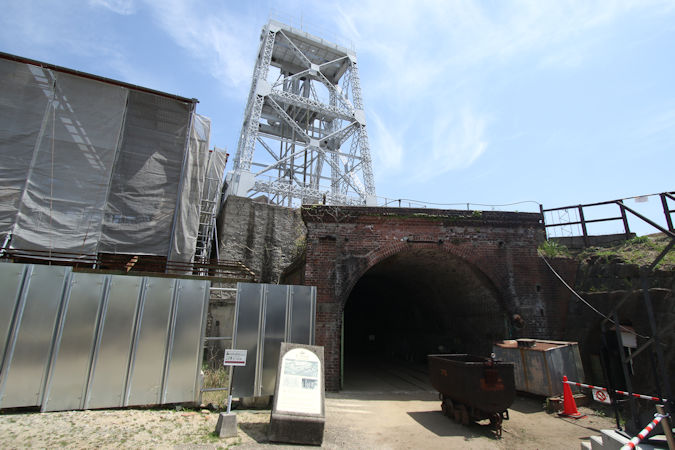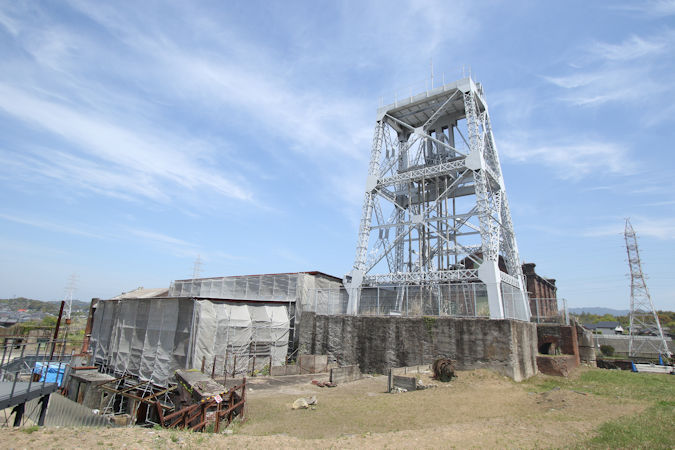 1908(明治41)年築で、鋼鉄製で、櫓の高さは18.9mです。上部の滑車(矢弦)が人員昇降用で、下部の滑車は資材搬入用として使われました。かつては深さ約274mの竪坑につながっていましたが、閉抗時に埋められています。