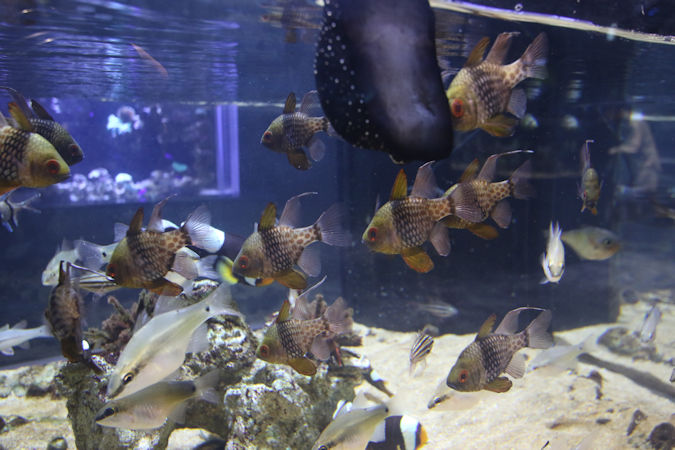 キラキラと美しい熱帯魚を中心とした、個水槽が立ち並ぶエリア