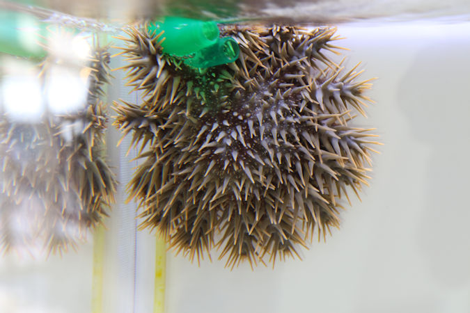 サンゴ礁の砂地に棲息し、大きな個体では長さ3mにまで成長しますが太さは2〜3cm程度の細長いナマコです。先端にある15本の触手を自在に動かします。