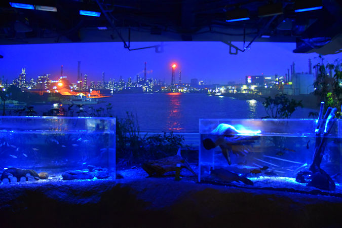スクリーンには様々な場所で昼夜撮影された多摩川の風景が映し出され、同じ水槽でも違った雰囲気に見えます。