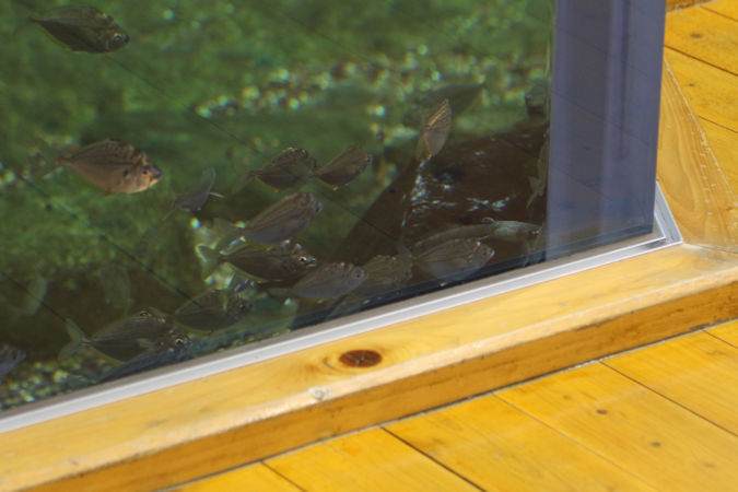 廊下の床には丸い窓があり、真上からカメや魚たちが泳ぐ姿が楽しめます。