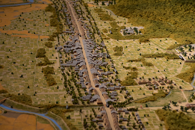 二川宿の復元ジオラマ。写真手前側が江戸方向、東側です。