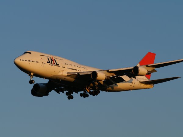 夕日に照らされ成田空港着陸するJA8077。