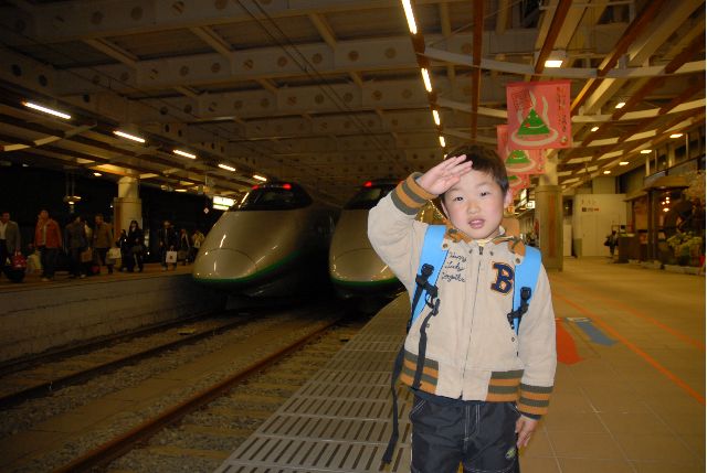 ホームはこの列車に乗ってきた乗客と、お出迎えの人と賑わっていました。僕ら親子と同じように新幹線をバックに写真を撮る方も多く、落ち着いて写真を撮れるようになるまでに10分くらいかかった感じです。