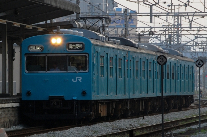 倉敷市駅前のラーメン屋で夕飯にし、岡山駅に戻って市内のお風呂屋さんへ。自分、初めて純粋な"銭湯"に入る(笑)。さて岡山駅へ戻ると、京都総合車両所から貸し出されている113系が。帰宅後調べてみると、地元で何度も乗った編成でした。