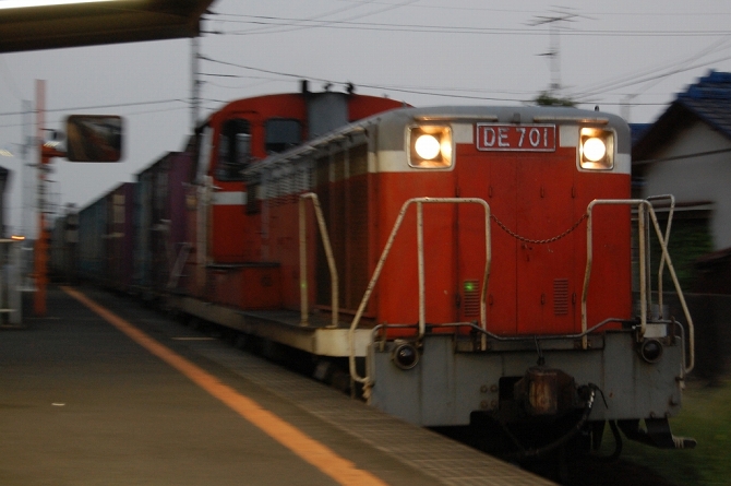 と、偶然にも貨物列車がやってきました。牽引はDE11と同型の同社オリジナル機DE70形。