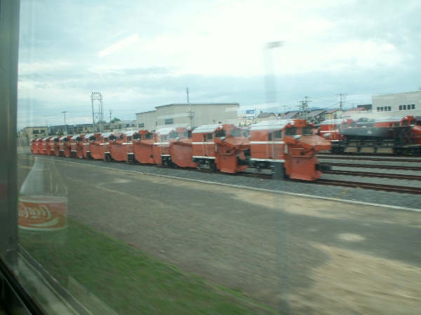 途中、旭川運転所の脇を通り抜けるのですが、もの凄いインパクトのある光景が。旭川運転所には16両のDE15形が所属していますが、これらの車両は夏期には構内入換などに使用するため、ラッセルヘッドは不要になります。その使わないラッセルヘッドを1線にずらりと留置しているのです。全て向きが揃えられている様は圧巻です。