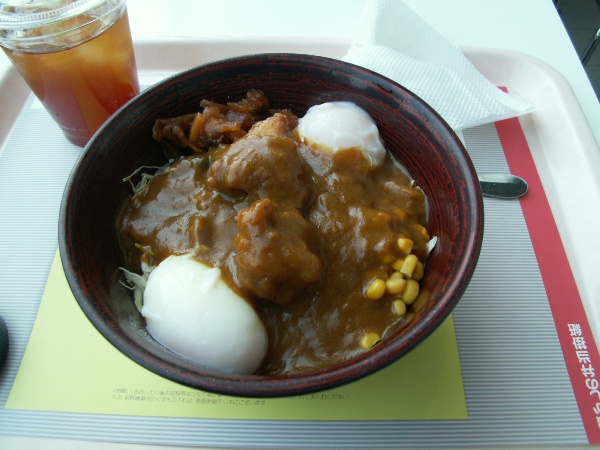 注文したのは「ハチクマライス」という当時の食堂車従業員の賄い飯だったもので、丼に盛られたご飯の上に千切りキャベツ、コーン、鶏の唐揚げ、温泉卵、カレーが乗っており、全てをかき混ぜて手早く食べることが出来るよう工夫されたものだったようです。