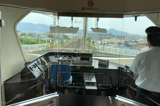 そして、伊勢志摩ライナーの特徴といえば、運転席後ろのデッキからの展望スペース。乗車しているすべての人が楽しめるようにあえてデッキに設けられています。その代わり腰掛などはなく少し寄りかかれる程度の柵?が設置してあります。