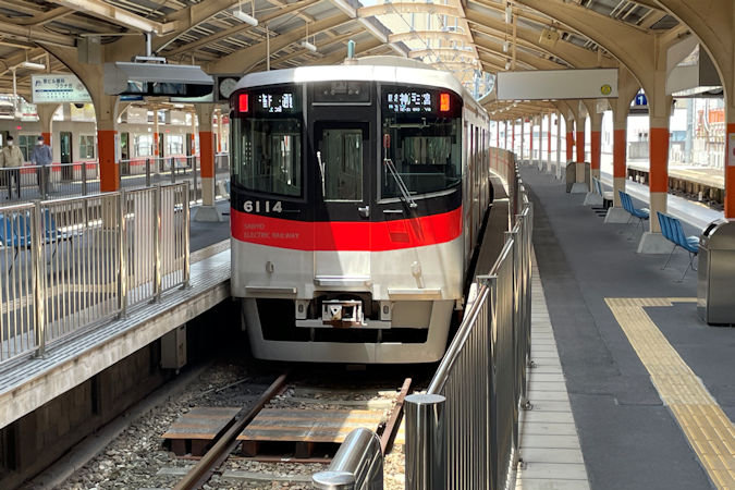やって来たのは山陽電鉄の車両ですね。大阪梅田と山陽姫路の間を走る転換クロスシートの車両で同区間を走る新快速に対抗する目的の車両なのかな?また、関西地区の乗り換えのスタンダードなのか、途中駅でも左右の扉を開いて階段を使わなくても隣のホームへ行き来できるのは便利ですね。知らないでいると自分側の扉開かないの???って思ってしまいそうですね。