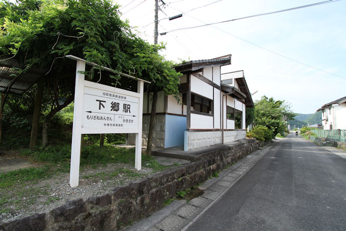 下郷駅跡でして、この上流側にもいくつか駅があったらしいのですが今更戻るのも時間が足りないと言うことで妥協。 この下郷駅は現役時代は相対式1面2線かそれに似たホームだったらしく、道路を挟んで同じ高さの石組みが残っていました。駅舎は当然ありませんでしたが、短いながらも駅前通りだった道はしっかり残っていました。 廃線から相当な時間が経っていますが、意外と残っているもんですね。