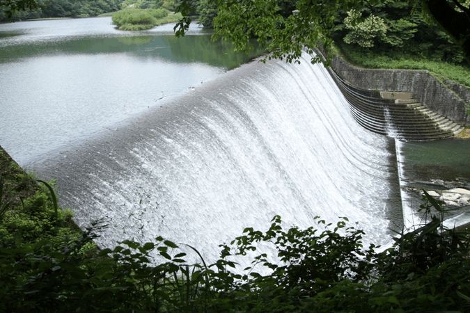 日本一美しいダムとまで呼ばれる白水溜池(堰堤の高さが15mに満たないので正式なダムではない)ですが、噂通りの優美さ!越流した水が白糸の如く流れ落ちる様はいつまで眺めていても飽きません。その優美さは機能性も兼ね備えており、火山性の土地で侵食に脆い両岸を保護し同時に中央分の水流も緩やかにするために左右の水を曲線と階段を用いて中央に集める構造。向かって左側は滑らかな曲線を描いています。