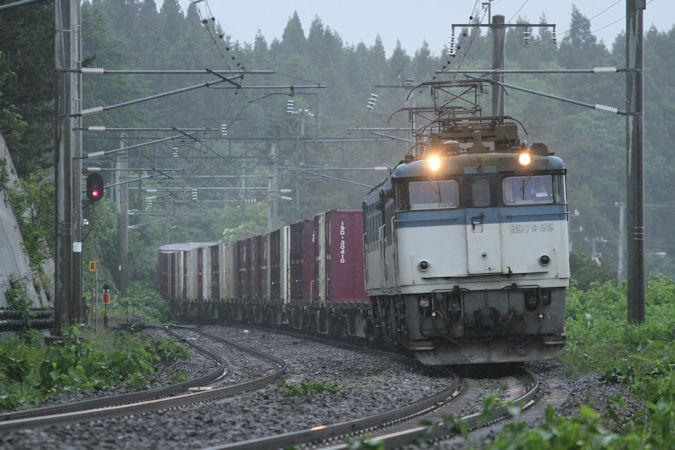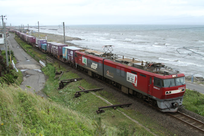 下りの貨物は台風の影響でダイヤが崩壊しており、何がいつ来るか全く読めない状況でしたが、上りは定刻で運転されていたようなのでED79形牽引の貨物を江差線の釜谷まで向かい撮影。