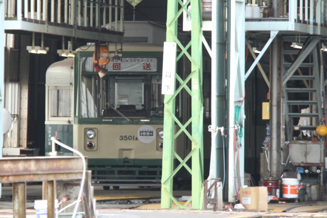 次の場所へ行く前にラッシュで車両の出払った江波車庫を見に行くと、奥の方に3500形が留置されていました。左奥には150形。3500形にはPASPY関連機器が搭載されているようで、予備の予備だとは思うのですが一応は廃車する気もないようですね。
