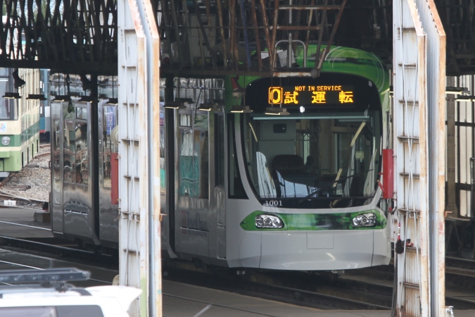 続いて向かったのは荒手車庫。新車の1001号が試運転しているということで撮影に来ました。というか今回はこれが本題だったのですが…車庫の奥で調整中でした。