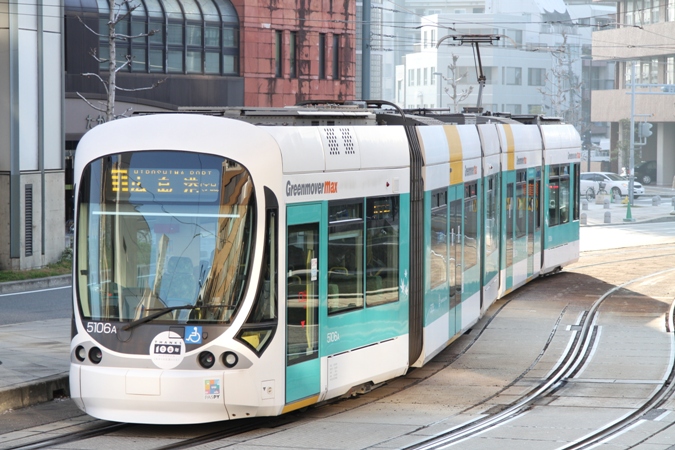 十日市交差点を左折してきました。本当であればその細長い前面を強調するために真正面から撮影したかったのですが、後ろに写っている1900形や手前を横切る乗用車に遮られ、ようやくこのカットで見通せました。この角度でも充分に面長ですね。
