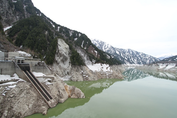 黒部ダムに到着。当初は晴れ予想でしたが天候の悪化が早まり薄曇りの状態に。加えて水位も低く、決して最高の眺めというわけではありませんでしたが、眼下に広がる巨大建造物にはただただ圧倒。そして広角レンズで背後の山々まできっちり写し込めて満足。