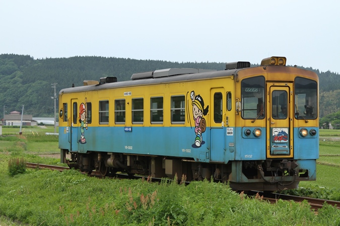羽後長戸呂〜松葉の直線区間を周辺の風景を入れつつ撮影。背後の山が少々霞んでしまいましたが、黄色い鮮やかな車体が良く映えます。何より車両以外に人工物が写り込んでいないのがいいですねー。
