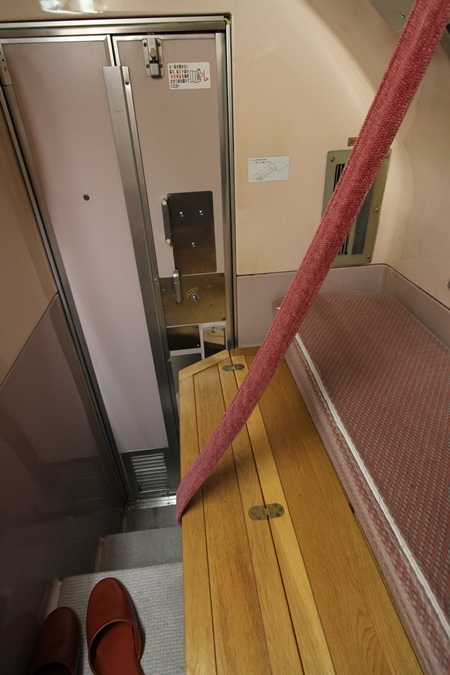 室内を出入り口側から。シーツ・毛布・枕・ハンガー・浴衣が置かれています。右の背もたれは固定されておらず、起きている時にレール方向を向いて座る時に動かして使います。自分でベッドメイキングしなければならない寝台というのはこのソロ上段ぐらいのものでしょう。
