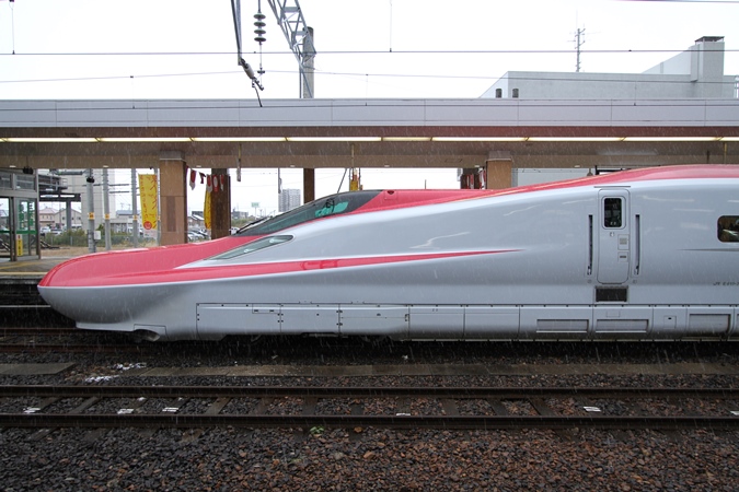 こちらのホームから距離があるので先頭部を横から撮影。E5系よりもさらに長いノーズということですが、乗務員扉から運転席が遠い…。