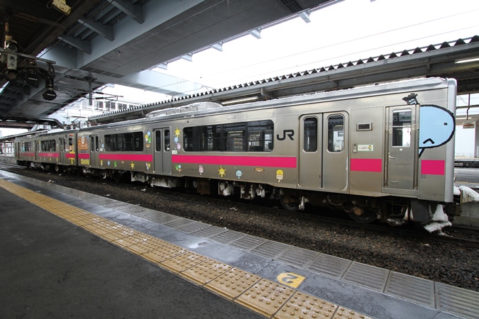 701系もかもされた…ように見えて、連結部など車体の帯がキャラクターより上になっている場所もあり完全にはかもされていないようです。