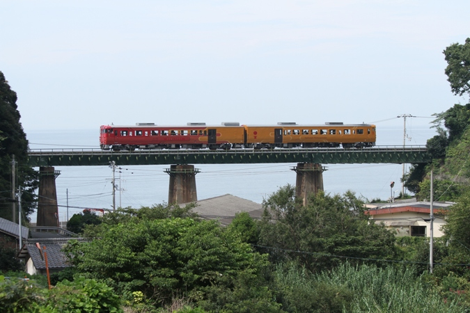 さて、2往復目往路1発目は最初に撮った串〜喜多灘の鉄橋をもうちょっと麓の別アングルから。…こっちの方がしっくり来ます。光線も午前ならもっとマシでしたし、背後の海が晴れ渡っていればこちらを選択した方がなお良いでしょう。
