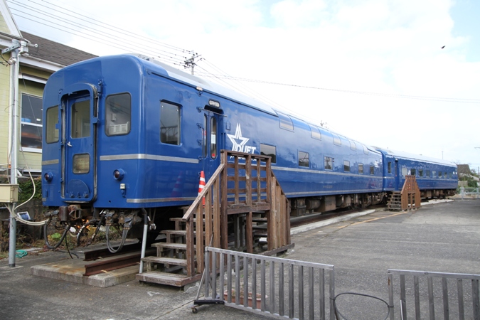 なお、阿久根駅に立ち寄った理由はもちろんこの「あくねツーリングSTAYtion」の撮影のため。寝台車が引退後も引き続き寝台車として使用されているのは嬉しい限り。トレインマークはほぼ色褪せてしまい何が印刷されていたか読み取るのも困難なほどになっていましたが、車両自体はご覧の通りしっかり手入れが行き届いていました。