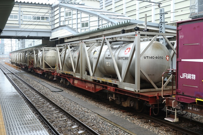 荷も少々特徴的で、編成後部に日産化学工業宛の希硝酸などを積載したタンクコンテナが連なっています。