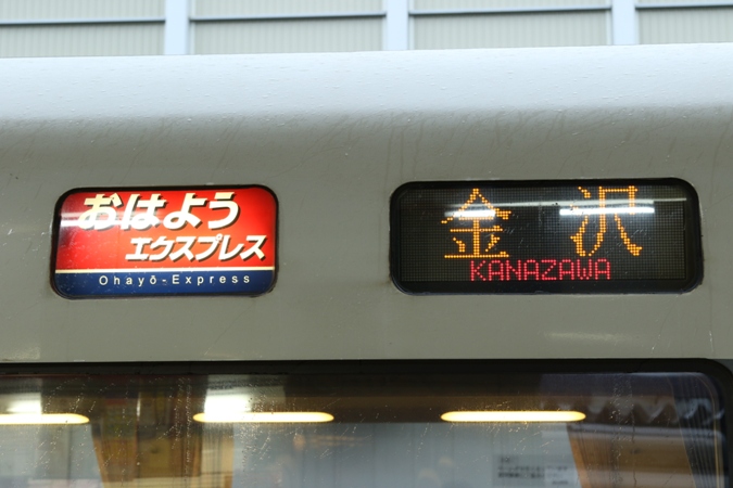 停車中に「はくたか 和倉温泉」の表示を撮影。LEDが切れてしまうのは仕方ありません。