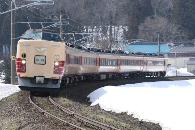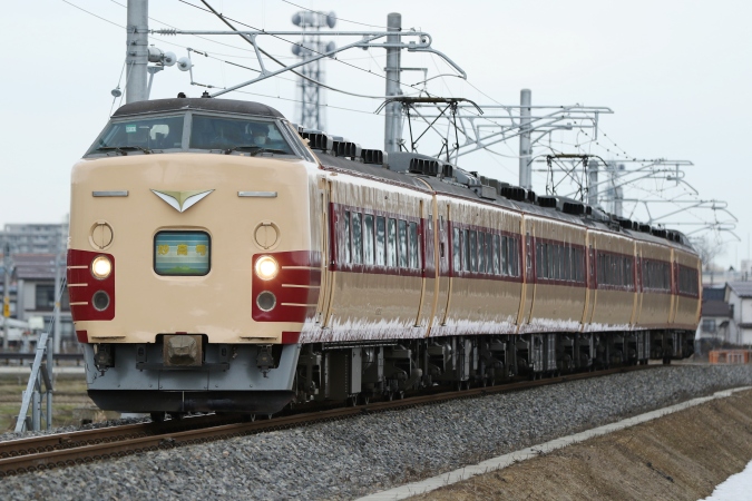 来ました「懐かしの特急みのり」。新潟行きの8日の便は4灯のクハ481-1508先頭なので、先頭を重視した構図で撮影したいと思っており、この場所はうってつけでした。ギリギリですが正面に日も回りバッチリの出来栄え!