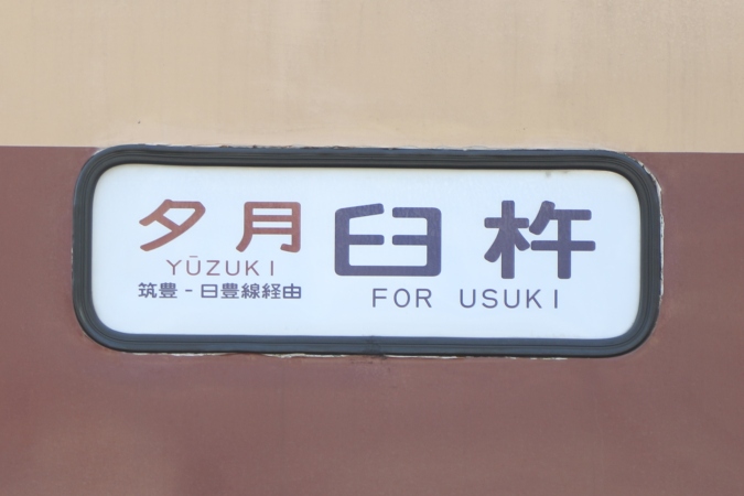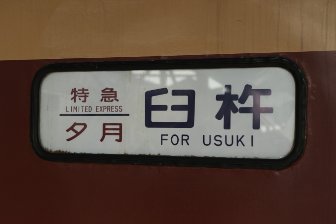 側面幕はかなり凝っており、各車両2ヶ所ずつの計6ヶ所全て違うものが貼られていました。 日豊本線基準で海側となる方から順に紹介。クハ481-256には「夕月 筑豊-日豊線経由 臼杵」。後に紹介する山側のものとややデザインが異なります。
